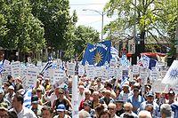 The dispute achieved international status after the breakup of Yugoslavia, when the concerns of the Macedonian Greeks rose to extreme manifestations.[66] On 14 February 1992, about one million Greek Macedonians turned out in the streets of Thessaloniki to demonstrate their objection to the name Macedonia being a part of the name of the then newly established Republic of Macedonia using the slogan "Macedonia is Greece".[67] Following the recognition of the Republic of Macedonia by the United States, another rally was held in Thessaloniki on 31 March 1994, while two major rallies, organized by the Macedonian Greek community in Australia, were held in Melbourne in 1992 and 1994, with around 100,000 people taking part in each of these.[68]