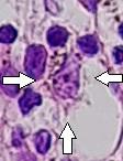 ![]() A macrophage stretching its "arms" (filopodia)[1] to engulf two particles, possibly pathogens, in a mouse. Trypan blue exclusion staining. | |