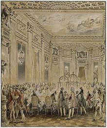 Jeanne’s golden age had finally truly arrived. She was rid of Choiseul and Grammont, comte Jean du Barry was dealt with and her family had the benefits they deserved as relations to the mistress. Her mother, Anne, was now Marquise de Montrabé, residing in a luxurious apartment in the Couvent (convent) de Sainte-Elisabeth. While Jeanne was part of the faction that brought down the duc de Choiseul,[15] she was unlike her late predecessor, Madame de Pompadour, in that she had little interest in politics,[16] preferring rather to pass her time ordering new ravishing gowns and all sorts of complementary jewellery. However, the king went so far as to let her participate in state councils.[17] A note in a modern edition of the Souvenirs of Mme. Campan recalls an anecdote: the king said to the duc de Noailles, that with Madame du Barry he had discovered new pleasures; "Sire" – answered the duke – "that's because your Majesty has never been in a brothel."[18] While Jeanne was known for her good nature and support of artists, she grew increasingly unpopular because of the king's financial extravagance towards her. She was forever in debt despite her huge monthly income from the king – at one point three hundred thousand livres.[19]