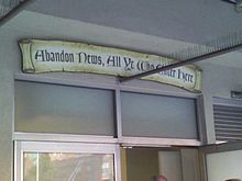 Stewart served not only as host but also as a writer and executive producer of the series. He recalls that he initially struggled with the Kilborn holdover writers to gain control of the show and put his own imprint on the show's voice, a struggle that led to the departure of a number of the holdover writers.[62] Instrumental in shaping the voice of the show under Stewart was former editor of The Onion Ben Karlin who, along with fellow Onion contributor David Javerbaum, joined the staff in 1999 as head writer and was later promoted to executive producer. Their experience in writing for the satirical newspaper, which uses fake stories to mock real print journalism and current events, would influence the comedic direction of the show; Stewart recalls the hiring of Karlin as the point at which things "[started] to take shape". Describing his approach to the show, Karlin said, "The main thing, for me, is seeing hypocrisy. People who know better saying things that you know they don't believe."[9]