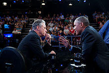 On September 15, 2003, Senator John Edwards became the first candidate to announce that they were running for president on the show, causing Jon Stewart to jokingly inform him that their show was "fake" and he might have to reannounce elsewhere.[79] On November 17, 2009, Vice President Joe Biden appeared on the show, making him the first sitting vice president to do so.[80] On October 27, 2010, President Barack Obama became the first sitting U.S. president to be interviewed on the show, wherein Obama commented he "loved" the show.[81] Obama took issue with Stewart's suggestion that his health care program was "timid."[82]