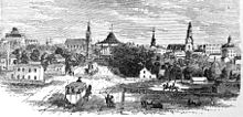 The cornerstone for the Wisconsin capitol was laid in 1837, and the legislature first met there in 1838. On October 9, 1839, Kintzing Prichett registered the plat of Madison at the registrar's office of the then-territorial Dane County.[24] Madison was incorporated as a village in 1846, with a population of 626. When Wisconsin became a state in 1848, Madison remained the capital, and the following year it became the site of the University of Wisconsin (now University of Wisconsin–Madison). The Milwaukee & Mississippi Railroad (a predecessor of the Milwaukee Road) connected to Madison in 1854. Madison incorporated as a city in 1856, with a population of 6,863, leaving the unincorporated remainder as a separate Town of Madison.[25] The original capitol was replaced in 1863 and the second capitol burned in 1904. The current capitol was built between 1906 and 1917.[26]
