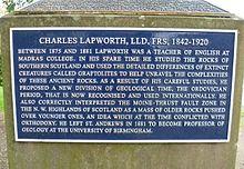 - Charles Lapworth FRS, LLD, FGS (20 September 1842 – 13 March 1920) taught English at Madras. He went on to be the first Professor of Geology at the University of Birmingham. The latter's Lapworth Museum is named in his honour, and holds his archive. He is known for identifying the Ordovician period.[3]