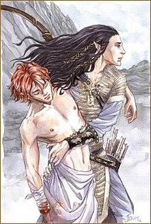 In Aman, he was of the Noldorin line for kingship—hence his father-name, "Nelyafinwë", which was Quenya for "Finwë the third [in succession]"—but unlike his royal kin, Maedhros had auburn hair inherited from his maternal grandfather, Mahtan,[T 4] to whom Maedhros was said to be alike in face and disposition.[1] He preferred and was remembered by his mother-name, "Maitimo," which meant "well-shaped one" (a reference to his comeliness), but was known as "Russandol", his epessë for "copper-top", to his family.[T 4] His tremendous height earned him the appellation "the Tall".