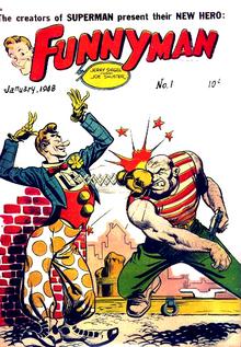 In late 1947, Superman creators Jerry Siegel and Joe Shuster collaborated once again with editor Vin Sullivan, who had worked with the writer-artist team during their nascent days freelancing for National Allied Publications, the future DC Comics. The duo had decamped to Magazine Enterprises after leaving National Allied (by then called National Comics) and suing to regain the rights to Superman and their later creation, Superboy. Siegel and Shuster brought most of their studio's artists with them, except for 1950s Superman penciler Wayne Boring, and created the new character Funnyman, a slapstick-comedian hero. Both as a comic book and as a comic strip, however, the character failed to find an audience.[1]
