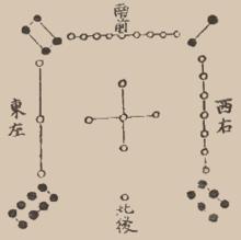 While ancient references to the pattern of even and odd numbers in the 3×3 magic square appears in the I Ching, the first unequivocal instance of this magic square appears in the chapter called Mingtang (Bright Hall) of a 1st-century book Da Dai Liji (Record of Rites by the Elder Dai), which purported to describe ancient Chinese rites of the Zhou dynasty.[5] [6][7][8] These numbers also occur in a possibly earlier mathematical text called Shushu jiyi (Memoir on Some Traditions of Mathematical Art), said to be written in 190 BCE. This is the earliest appearance of a magic square on record; and it was mainly used for divination and astrology.[5] The 3×3 magic square was referred to as the "Nine Halls" by earlier Chinese mathematicians.[7] The identification of the 3×3 magic square to the legendary Luoshu chart was only made in the 12th century, after which it was referred to as the Luoshu square.[5][7] The oldest surviving Chinese treatise that displays magic squares of order larger than 3 is Yang Hui's Xugu zheqi suanfa (Continuation of Ancient Mathematical Methods for Elucidating the Strange) written in 1275.[5][7] The contents of Yang Hui's treatise were collected from older works, both native and foreign; and he only explains the construction of third and fourth-order magic squares, while merely passing on the finished diagrams of larger squares.[7] He gives a magic square of order 3, two squares for each order of 4 to 8, one of order nine, and one semi-magic square of order 10. He also gives six magic circles of varying complexity.[9]