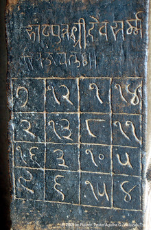 There is a well-known 12th-century 4×4 normal magic square inscribed on the wall of the Parshvanath temple in Khajuraho, India.[18][17][49]