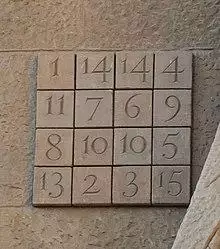 The Passion façade of the Sagrada Família church in Barcelona, conceptualized by Antoni Gaudí and designed by sculptor Josep Subirachs, features a trivial order 4 magic square: The magic constant of the square is 33, the age of Jesus at the time of the Passion.[52] Structurally, it is very similar to the Melancholia magic square, but it has had the numbers in four of the cells reduced by 1.