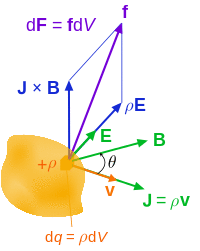 where is the force density (force per unit volume) and is the charge density (charge per unit volume). Next, the current density corresponding to the motion of the charge continuum is