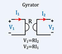 A gyrator is a two-port element used in network analysis. The gyrator is the complement of the transformer; whereas in a transformer, a voltage on one port will transform to a proportional voltage on the other port, in a gyrator, a voltage on one port will transform to a current on the other port, and vice versa.