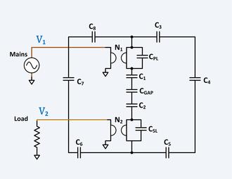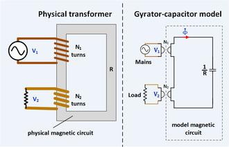 The gyrator–capacitor model[1] - sometimes also the capacitor-permeance model[2] - is a lumped-element model for magnetic circuits, that can be used in place of the more common resistance–reluctance model. The model makes permeance elements analogous to electrical capacitance (see magnetic capacitance section) rather than electrical resistance (see magnetic reluctance). Windings are represented as gyrators, interfacing between the electrical circuit and the magnetic model.