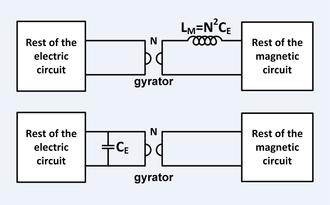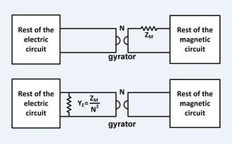 A winding of N turns is modeled by a gyrator with a gyration resistance of N ohms.[1]:100