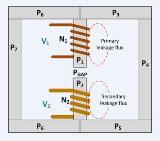 N1, N2, and N3 are the number of turns in the three primary windings. N4, N5, and N6 are the number of turns in the three secondary windings. Φ1, Φ2, and Φ3 are the fluxes in the three vertical elements. Magnetic flux in each permeance element in webers is numerically equal to the charge in the associate capacitance in coulombs. The energy in each permeance element is the same as the energy in the associated capacitor.