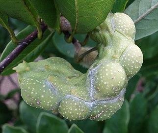 These magnolias produce a reddish-green, knobby aggregate fruit about 2 in long that matures and opens in early autumn. Mature fruit opens by slits to reveal orange-red seeds, but the fruits often drop before developing fully.