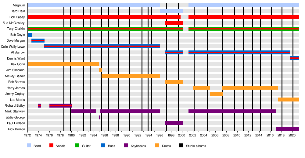 Magnum are an English hard rock band. They were formed in Birmingham by Tony Clarkin (guitar, songwriter) and Bob Catley (vocals) in order to appear as the resident band at the Rum Runner nightclub in the city. Magnum have undergone several changes in personnel over the years; however, the core of Catley and Clarkin remain.