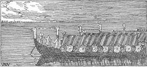 In 1058, Magnus headed an expedition into the Irish Sea that sought to extend Norwegian authority in the region, the Norwegians siding with a faction that opposed the Norse-Gaelic king Echmarcach mac Ragnaill.[5] The expedition also appears to have supported a branch of the Norse-Gaelic dynasty of Ivar that opposed Irish king Diarmait mac Maíl na mBó.[6] Magnus commanded a fleet that, in addition to Norway, recruited men from Orkney, the Hebrides, and Dublin.[7] His forces were later active in Wales[8] and perhaps in England, and English chronicler John of Worcester associates the Norwegian fleet (along with the Welsh ruler Gruffydd ap Llywelyn), with returning the exiled Ælfgar, Earl of Mercia to power.[9] The Irish Annals of Tigernach goes further in claiming that Magnus's goal was to seize power in England, but this is not supported by Welsh and English sources[10] which also includes the Annales Cambriae and the Anglo-Saxon Chronicle.[11]