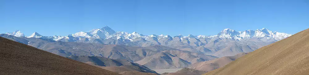 Mahālangūr Himāl (Nepali: महालङ्गूर हिमाल, Mahālaṅgūra himāla) is a section of the Himalayas in northeast Nepal and south-central Tibet of China extending east from the pass Nangpa La between Rolwaling Himal and Cho Oyu, to the Arun River.[1] It includes Mount Everest, Lhotse, Makalu, and Cho Oyu — four of Earth's six highest peaks. On the Tibetan side it is drained by the Rongbuk and Kangshung Glaciers and on the Nepali side by Barun, Ngojumba and Khumbu Glaciers and others. All are tributaries to the Koshi River via Arun River on the north and east or Dudh Kosi on the south.