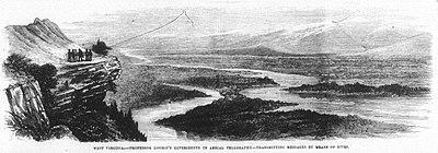 A November 1872 report in the Washington Chronicle stated that, using kites and galvanometers, "Loomis' aërial system has just been tried on lines of different lengths, with variable, but perfectly satisfactory results. On a line of 400 miles lineal distance (800 mile circuit) the tests were perfectly satisfactory at an elevation of 2100 feet. At a mountain elevation of 1200 feet the tests and results that were very strong at a distance of 14 miles."[13] In a January 1873 interview printed in the same paper, Loomis was quoted as saying that during the previous summer he had "telegraphed by my imperfect experiments in the most satisfactory manner", "on the spurs of the Blue Ridge Mountains, in Virginia, at a mountain elevation of about thirteen hundred feet, with kites let up with a small copper wire of about five hundred feet in length. The signals were perfect, as indicated with a galvanometer at the two stations, when the connection was made with the earth completing the circuit".[14]