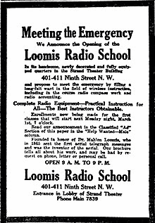- ^ "Loomis Radio School" (advertisement), Washington (D.C.) Times, February 26, 1920, page 4. Mary Texanna Loomis was a distant cousin of Mahlon Loomis.