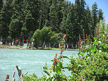 The Mahodand Lake lies at the foothills of Hindu kush mountains at an elevation of 2,865 m (9,400 ft), surrounded by the meadows, mountains and dense forests.[4] Similarly, the banks of Mahodand lake are covered by pines and pastures that serve as a camping site during the summer. The Mahodand lake is fed by melting glaciers and springs of the Hindu Kush mountain and gives rise to Ushu Khwar, the major left tributary of the Swat River.[5]