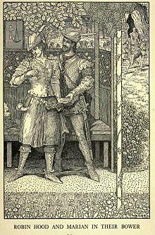 Maid Marian (or Marion) is never mentioned in any of the earliest extant ballads of Robin Hood. She appears to have originally been a character in May Games festivities (held during May and early June, most commonly around Whitsun)[1] and is sometimes associated with the Queen or Lady of May or May Day. Jim Lees in The Quest for Robin Hood (p. 81) suggests that Maid Marian was originally a personification of the Virgin Mary. Francis J. Childe argues that she was originally portrayed as a trull associated with a lascivious Friar Tuck: "She is a trul of trust, to serue a frier at his lust/a prycker a prauncer a terer of shetes/a wagger of ballockes when other men slepes."[2] Both a "Robin" and a "Marian" character were associated with May Day by the 15th century, but these figures were apparently part of separate traditions; the Marian of the May Games is likely derived from the French tradition of a shepherdess named Marion and her shepherd lover Robin, recorded in Adam de la Halle's Le Jeu de Robin et Marion, circa 1283.[3] It isn't clear if there was an association of the early "outlaw" character of Robin Hood and the early "May Day" character Robin, but they did become identified, and associated with the "Marian" character, by the 16th century.[4] Alexander Barclay, writing in c. 1500, refers to "some merry fytte of Maid Marian or else of Robin Hood".[5] Marian remained associated with May Day celebrations even after the association of Robin Hood with May Day had again faded.[6] The early Robin Hood is also given a "shepherdess" love interest, in Robin Hood's Birth, Breeding, Valor, and Marriage (Child Ballad 149), his sweetheart is "Clorinda the Queen of the Shepherdesses".[7] Clorinda survives in some later stories as an alias of Marian.[8]
