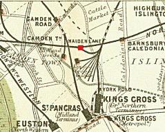 This Maiden Lane station - 51°32′27″N 0°07′37″W / 51.540917°N 0.127051°W - was a short distance northwest of the Great Northern Railway station and near the present High Speed 1 tunnel portal. It also served King's Cross Goods Yard. It closed in 1916 [2] or 1917,[3] after the LNWR in 1916 electrified the southern pair of the four tracks for passenger services, leaving the northern pair, on which the station was built, solely for steam-hauled goods traffic.