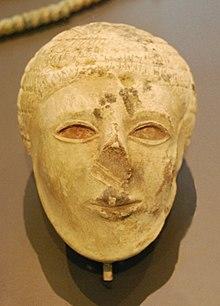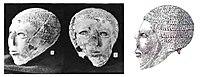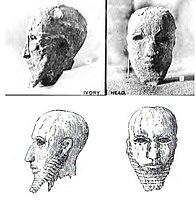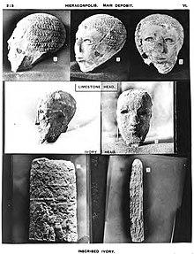 The main deposit dates to the early Old Kingdom,[6] but the artistic style of the objects in the deposit indicate that they were from Naqada III and were moved into the deposit at a later date. The other important item in the deposit clearly dates to the late prehistoric.[8] This object, the Scorpion Macehead, depicts a king known only by the ideogram for scorpion, now called Scorpion II, participating in what seems to be a ritual irrigation ceremony.[9] Although the Narmer Palette is more famous because it shows the first king to wear both the crowns of Upper and Lower Egypt, the Scorpion Macehead indicates some early military hostility with the north by showing dead lapwings, the symbol of Lower Egypt, hung from standards.[9]