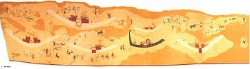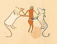 Several interpretations of the themes and designs visible in the Nekhen frescoe have been associated with a distinctly foreign artifact found in Egypt, the Gebel el-Arak Knife (c. 3500-3200 BCE), with a Mesopotamian scene described as the Master of animals, showing a presumed figure between two lions, presumed fighting scenes, or the boats.[16][17][18][19]