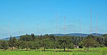 Mainflingen longwave transmitter is a large facility for commercial longwave transmissions at Mainflingen, Hesse, Germany, which was built in 1956. It uses several T- and triangle antennas, which are mounted on guyed masts of lattice steel, insulated against ground. The used masts have heights between 150 metres and 200 metres.