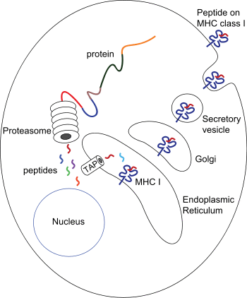 - In MHC class I, any nucleated cell normally presents cytosolic peptides, mostly self peptides derived from protein turnover and defective ribosomal products. During viral infection, intracellular microorganism infection, or cancerous transformation, such proteins degraded in the proteosome are as well loaded onto MHC class I molecules and displayed on the cell surface. T lymphocytes can detect a peptide displayed at 0.1%-1% of the MHC molecules.
