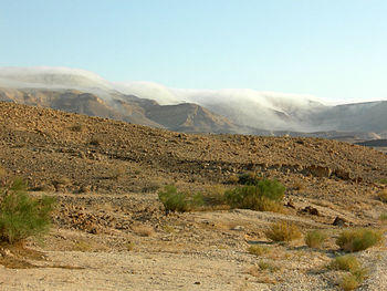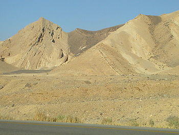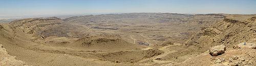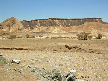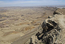The center of the Negev is dominated by northeast-southwest anticlinal ridges. The crests of four ridges host five deep valleys surrounded by steep walls. The upper half consists of hard limestone and dolomite, and the bottom of friable sandstone. Each valley, known as a makhtesh, is drained by a narrow river bed.[4]