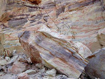 Where a hard outer layer of rock covers softer rocks, erosion removes the softer minerals relatively quickly, and they are washed away from under the harder rock. The harder rocks eventually collapse under their own weight, and a crater-like valley structure is formed. In Negev and Sinai makhteshes, the hard rocks are limestone and dolomites, while the inner softer rocks are chalk or sandstone.[3]