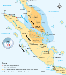 Across the South China Sea in the 14th century, another Malay realm, the Bruneian Empire was on the rise to become the most powerful polity in Borneo. By the middle of the 15th century, Brunei entered into a close relationship with the Malacca Sultanate. The sultan married a Malaccan princess, adopted Islam as the court religion, and introduced an efficient administration modelled on Malacca.[78] Brunei profited from trade with Malacca but gained even greater prosperity after the great Malay port was conquered by the Portuguese in 1511. It reached its golden age in the mid-16th century when it controlled land as far south as present day Kuching in Sarawak, north towards the Philippine Archipelago.[79] The empire broadened its influence in Luzon by defeating Datu Gambang of the Kingdom of Tondo and by founding a satellite state, Kota Seludong in present-day Manila, setting up the Muslim Rajah, Rajah Sulaiman I as a vassal to the Sultanate of Brunei. Brunei also expanded its influence in Mindanao, Philippines when Sultan Bolkiah married Leila Macanai, the daughter of the Sultan of Sulu. However, states like the Huangdom of Pangasinan, Rajahnate of Cebu and Kedatuan of Madja-as tried to resist Brunei's and Islam's spread into the Philippines. Brunei's fairly loose river based governmental presence in Borneo projected the process of Malayisation. Fine Malay Muslim cultures, including the language, dress and single-family dwelling were introduced to the natives primarily from ethnic Dayaks, drawing them into the Sultanate. Dayak chiefs were incorporated into the Malay hierarchy, being given the official titles of Datuk, Temenggong and Orang Kaya. In West Borneo, the development of such sultanates of Sarawak, Sambas, Sukadana and Landak tells a similar tale of recruitment among Dayak people.[80]
