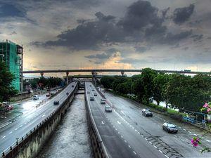 The cable bridge of Damansara–Puchong Expressway spanning over its intersection with Federal Highway in Petaling Jaya. Kuala Lumpur can be seen in the distant background on the right corner of the picture.