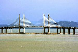 The history of highways in Penang began in the 1970s when the Malaysian federal government decided to build the Penang Bridge, connecting Seberang Perai and Penang Island. The construction of the Penang Bridge, between Perai on the mainland and Gelugor on Penang Island, began in 1982 and was completed in 1985. This bridge was officially opened on 14 September 1985 by then Malaysian Prime Minister, Mahathir Mohamad.