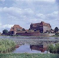 The town was built in Prussia around the fortress Ordensburg Marienburg, which was founded in 1274 on the east bank of the river Nogat by the Teutonic Knights. Both the castle and the town (named Marienburg in German and Malborg or Malbork in Polish) were named for their patron saint, the Virgin Mary. This fortified castle became the seat of the Teutonic Order and Europe's largest Gothic fortress. During the Thirteen Years' War, the castle of Marienburg was pawned by the Teutonic Order to their soldiers from Bohemia. They sold the castle in 1457 to King Casimir IV of Poland in lieu of indemnities.[2][3] From 1457 to 1772 the castle was one of Poland's royal residences.[4] Polish Kings often stayed in the castle, especially when travelling to the nearby city of Gdańsk. Also astronomer Nicolaus Copernicus visited the castle.[5] From 1568 the castle also housed the Polish Admiralty (Komisja Morska) and in 1584 one of the Polish Royal Mints was established here. The largest arsenal of the Polish–Lithuanian Commonwealth was located in the castle.