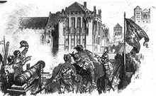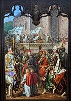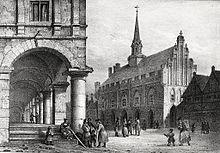 The Teutonic Order weakened greatly after the Battle of Grunwald against advancing Poles and Lithuanians.[6] The town was burned by the Teutonic Knights in 1410 before the siege of the castle by Poles,[5] however it remained under Teutonic control after the siege. In 1457, during the Thirteen Years' War, the castle was sold to Poland by Czech mercenaries of the Teutonic Knights,[5] and the Teutonic Order transferred its seat to Königsberg (now Kaliningrad, Russia). The town of Marienburg, under Mayor Bartholomäus Blume and others, resisted the Poles for three further years. But when the Poles finally took control, Blume was hanged and quartered, and fourteen officers and three remaining Teutonic knights were thrown into dungeons, where they met a miserable end.[2] A monument to Blume was erected in 1864.[7]