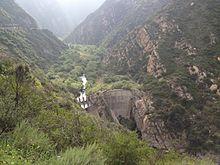 Malibu Creek is a year-round stream in western Los Angeles County, California. It drains the southern Conejo Valley and Simi Hills, flowing south through the Santa Monica Mountains, and enters Santa Monica Bay in Malibu, California. The Malibu Creek watershed drains 109 square miles (280 km2) and its tributary creeks reach as high as 3,000 feet (910 m) into Ventura County, California.[2] The creek's mainstem begins south of Westlake Village at the confluence of Triunfo Creek and Lobo Canyon Creek, and flows 13.4 miles (21.6 km)[3] to Malibu Lagoon.