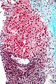 Mallory bodies in hepatocellular carcinoma. Trichrome stain.