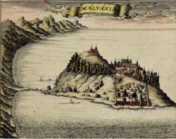Most ampelographers believe that the Malvasia family of grapes are of ancient origin, most likely originating in Crete, Greece.[3] The name "Malvasia" probably comes from Monemvasia, a medieval and early Renaissance Byzantine fortress on the coast of Laconia, known in Italian as "Malvasia"; this port would have acted as a trading center for wine produced in the eastern Peloponnese and perhaps in some of the Cyclades. During the Middle Ages, the Venetians became so prolific in the trading of "Malvasia wine" that merchant wine shops in Venice were known as malvasie.[3] The occasional claim that it might come from the district of Malevizi, near Iraklion, Crete is not taken seriously by scholars.[4][5]