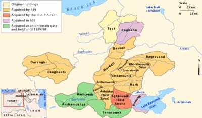 The family first appears in the early 4th century. Under the late Arsacid Kingdom of Armenia, the family occupied an important position: they were hereditary commanders-in-chief (sparapet) and royal tutors (dayeak) and controlled large domains, including most of Taron and Tayk. The Mamikonian increased their property further with the death of the last hereditary Patriarch of Armenia, Isaac in ca. 428, when they inherited many Church lands through the marriage of his only daughter to Hamazasp Mamikonian.[6]