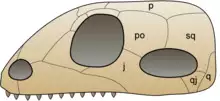 The first amniotes apparently arose in the Pennsylvanian subperiod of the Carboniferous. They descended from earlier reptiliomorph amphibious tetrapods,[21] which lived on land that was already inhabited by insects and other invertebrates as well as ferns, mosses and other plants. Within a few million years, two important amniote lineages became distinct: the synapsids, which would later include the common ancestor of the mammals; and the sauropsids, which now include turtles, lizards, snakes, crocodilians and dinosaurs (including birds).[22] Synapsids have a single hole (temporal fenestra) low on each side of the skull. One synapsid group, the pelycosaurs, included the largest and fiercest animals of the early Permian.[23] Nonmammalian synapsids are sometimes (inaccurately) called "mammal-like reptiles".[24][25]