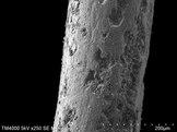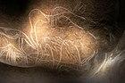 The coat consisted of an outer layer of long, coarse "guard hair", which was 30 cm (12 in) on the upper part of the body, up to 90 cm (35 in) in length on the flanks and underside, and 0.5 mm (0.020 in) in diameter, and a denser inner layer of shorter, slightly curly under-wool, up to 8 cm (3.1 in) long and 0.05 mm (0.0020 in) in diameter. The hairs on the upper leg were up to 38 cm (15 in) long, and those of the feet were 15 cm (5.9 in) long, reaching the toes. The hairs on the head were relatively short, but longer on the underside and the sides of the trunk. The tail was extended by coarse hairs up to 60 cm (24 in) long, which were thicker than the guard hairs. The woolly mammoth likely moulted seasonally, and the heaviest fur was shed during spring. Since mammoth carcasses were more likely to be preserved, possibly only the winter coat has been preserved in frozen specimens. Modern elephants have much less hair, though juveniles have a more extensive covering of hair than adults.[41] This is thought to be for thermoregulation, helping them lose heat in their hot environments.[42] Comparison between the over-hairs of woolly mammoths and extant elephants show that they did not differ much in overall morphology.[43] Woolly mammoths had numerous sebaceous glands in their skin, which secreted oils into their hair; this would have improved the wool's insulation, repelled water, and given the fur a glossy sheen.[44]