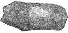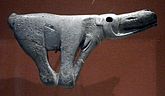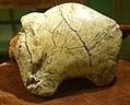 "Portable art" can be more accurately dated than cave art since it is found in the same deposits as tools and other ice-age artefacts. The largest collection of portable mammoth art, consisting of 62 depictions on 47 plaques, was found in the 1960s at an excavated open-air camp near Gönnersdorf in Germany. A correlation between the number of mammoths depicted and the species that were most often hunted does not seem to exist, since reindeer bones are the most frequently found animal remains at the site. Two spear throwers shaped as woolly mammoths have been found in France.[88] Some portable mammoth depictions may not have been produced where they were discovered, but could have moved around by ancient trading.[89]