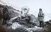 By 1929, the remains of 34 mammoths with frozen soft tissues (skin, flesh, or organs) had been documented. Only four of them were relatively complete. Since then, about that many more have been found. In most cases, the flesh showed signs of decay before its freezing and later desiccation.[132] Since 1860, Russian authorities have offered rewards of up to ₽1000 for finds of frozen woolly mammoth carcasses. Often, such finds were kept secret due to superstition. Several carcasses have been lost because they were not reported, and one was fed to dogs. In more recent years, scientific expeditions have been devoted to finding carcasses instead of relying solely on chance encounters. The most famous frozen specimen from Alaska is a calf nicknamed "Effie", which was found in 1948. It consists of the head, trunk, and a fore leg, and is about 25,000 years old.[123]