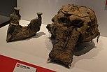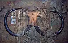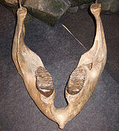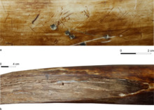 Several woolly mammoth specimens show evidence of being butchered by humans, which is indicated by breaks, cut marks, and associated stone tools. How much prehistoric humans relied on woolly mammoth meat is unknown, since many other large herbivores were available. Many mammoth carcasses may have been scavenged by humans rather than hunted. Some cave paintings show woolly mammoths in structures interpreted as pitfall traps. Few specimens show direct, unambiguous evidence of having been hunted by humans. A Siberian specimen with a spearhead embedded in its shoulder blade shows that a spear had been thrown at it with great force.[93] A specimen from the Mousterian age of Italy shows evidence of spear hunting by Neanderthals.[94] The juvenile specimen nicknamed "Yuka" is the first frozen mammoth with evidence of human interaction. It shows evidence of having been killed by a large predator, and of having been scavenged by humans shortly after. Some of its bones had been removed, and were found nearby.[95] A site near the Yana River in Siberia has revealed several specimens with evidence of human hunting, but the finds were interpreted to show that the animals were not hunted intensively, but perhaps mainly when ivory was needed.[96] Two woolly mammoths from Wisconsin, the "Schaefer" and "Hebior mammoths", show evidence of having been butchered by Palaeoamericans.[97][98]