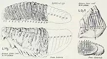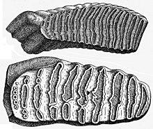 By the early 20th century, the taxonomy of extinct elephants was complex. In 1942, American palaoentologist Henry Fairfield Osborn's posthumous monograph on the Proboscidea was published, wherein he used various taxon names that had previously been proposed for mammoth species, including replacing Mammuthus with Mammonteus, as he believed the former name to be invalidly published.[13] Mammoth taxonomy was simplified by various researchers from the 1970s onwards, all species were retained in the genus Mammuthus, and many proposed differences between species were instead interpreted as intraspecific variation.[14] Osborn chose two molars (found in Siberia and Osterode) from Blumenbach's collection at Göttingen University as the lectotype specimens for the woolly mammoth, since holotype designation was not practised in Blumenbach's time. Russian palaeontologist Vera Gromova further proposed the former should be considered the lectotype with the latter as paralectotype. Both molars were thought lost by the 1980s, and the more complete "Taimyr mammoth" found in Siberia in 1948 was therefore proposed as the neotype specimen in 1990. Resolutions to historical issues about the validity of the genus name Mammuthus and the type species designation of E. primigenius were also proposed.[15] The paralectotype molar (specimen GZG.V.010.018) has since been located in the Göttingen University collection, identified by comparing it with Osborn's illustration of a cast.[8][16]