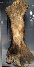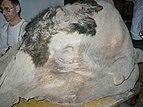 In 2007, the carcass of a female calf nicknamed "Lyuba" was discovered near the Yuribey River, where it had been buried for 41,800 years.[62][136] By cutting a section through a molar and analysing its growth lines, they found that the animal had died at the age of one month.[70] The mummified calf weighed 50 kg (110 lb), was 85 cm (33 in) high and 130 cm (51 in) in length.[137][138] At the time of discovery, its eyes and trunk were intact and some fur remained on its body. Its organs and skin are very well preserved.[139] "Lyuba" is believed to have been suffocated by mud in a river that its herd was crossing.[62][140] After death, its body may have been colonised by bacteria that produce lactic acid, which "pickled" it, preserving the mammoth in a nearly pristine state.[62]