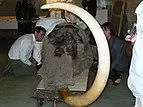 Between 1692 and 1806, only four descriptions of frozen mammoths were published in Europe. None of the remains of those five were preserved, and no complete skeletons were recovered during that time.[127] While frozen woolly mammoth carcasses had been excavated by Europeans as early as 1728, the first fully documented specimen was discovered near the delta of the Lena River in 1799 by Ossip Schumachov, a Siberian hunter.[128] While in Yakutsk in 1806, Michael Friedrich Adams heard about the frozen mammoth. Adams recovered the entire skeleton, apart from the tusks, which Shumachov had already sold, and one foreleg, most of the skin, and nearly 18 kg (40 lb) of hair. During his return voyage, he purchased a pair of tusks that he believed were the ones that Shumachov had sold. Adams brought all to the Zoological Museum of the Zoological Institute of the Russian Academy of Sciences, and the task of mounting the skeleton was given to Wilhelm Gottlieb Tilesius.[5][129] This was one of the first attempts at reconstructing the skeleton of an extinct animal. Most of the reconstruction is correct, but Tilesius placed each tusk in the opposite socket, so that they curved outward instead of inward. The error was not corrected until 1899, and the correct placement of mammoth tusks was still a matter of debate into the 20th century.[130][131]