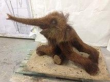 Other characteristic features depicted in cave paintings include a large, high, single-domed head and a sloping back with a high shoulder hump; this shape resulted from the spinous processes of the back vertebrae decreasing in length from front to rear. These features were not present in juveniles, which had convex backs like Asian elephants. Another feature shown in cave paintings was confirmed by the discovery of a frozen specimen in 1924, an adult nicknamed the "Middle Kolyma mammoth", which was preserved with a complete trunk tip. Unlike the trunk lobes of modern elephants, the upper "finger" at the tip of the trunk had a long pointed lobe and was 10 cm (3.9 in) long, while the lower "thumb" was 5 cm (2.0 in) and was broader. The trunk of "Dima" was 76 cm (2.49 ft) long, whereas the trunk of the adult "Liakhov mammoth" was 2 metres (6.6 ft) long.[39] The well-preserved trunk of a juvenile specimen nicknamed "Yuka" was described in 2015, and it was shown to possess a fleshy expansion a third above the tip. Rather than oval as the rest of the trunk, this part was ellipsoidal in cross section, and double the size in diameter. The feature was shown to be present in two other specimens, of different sexes and ages.[40]